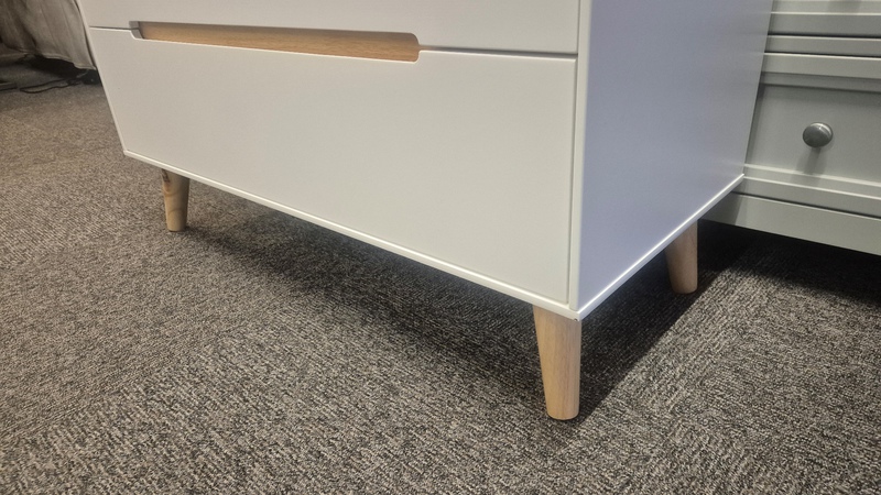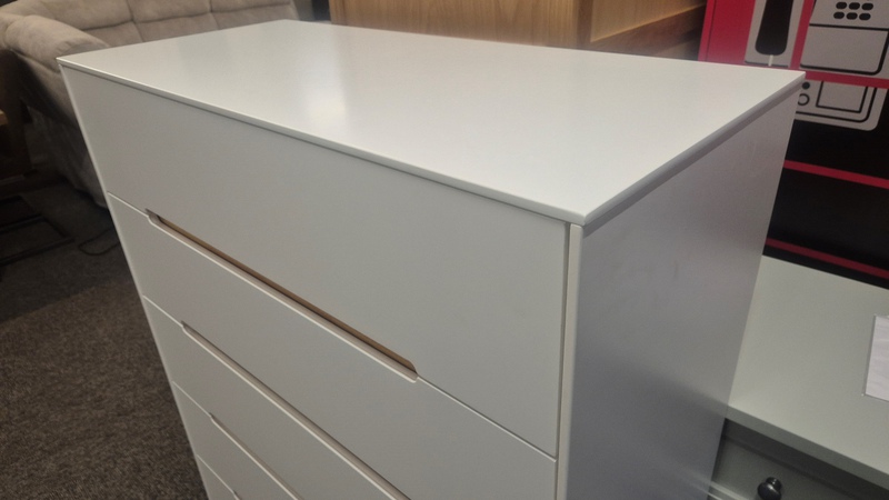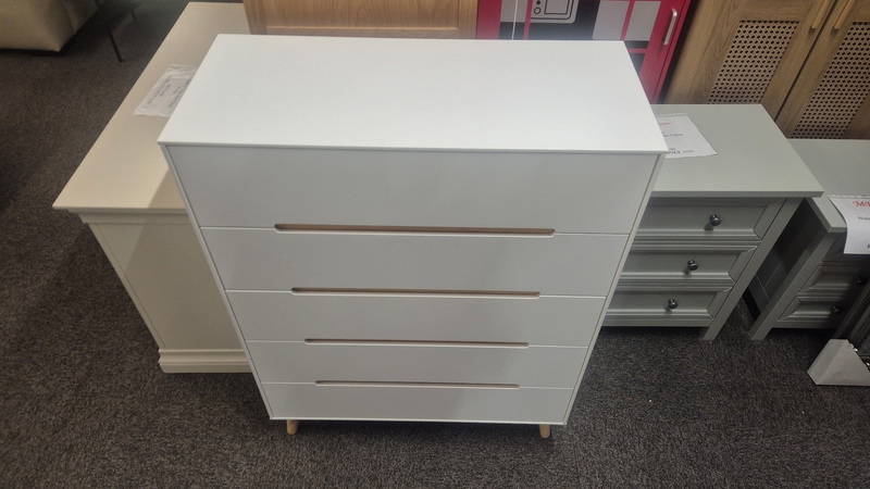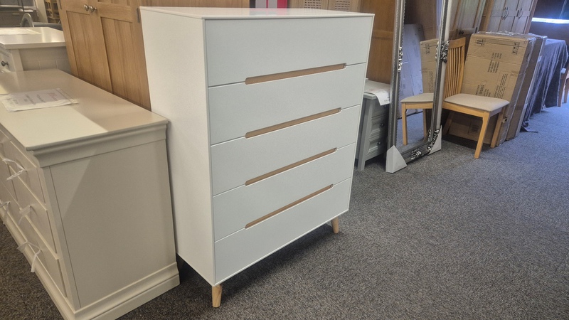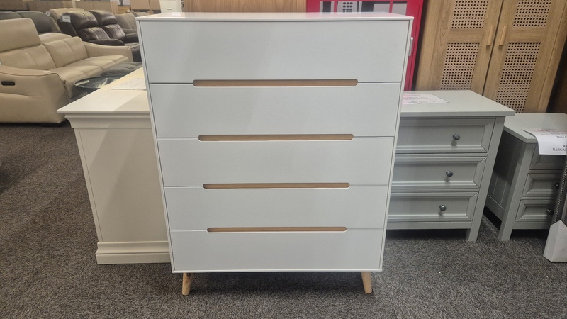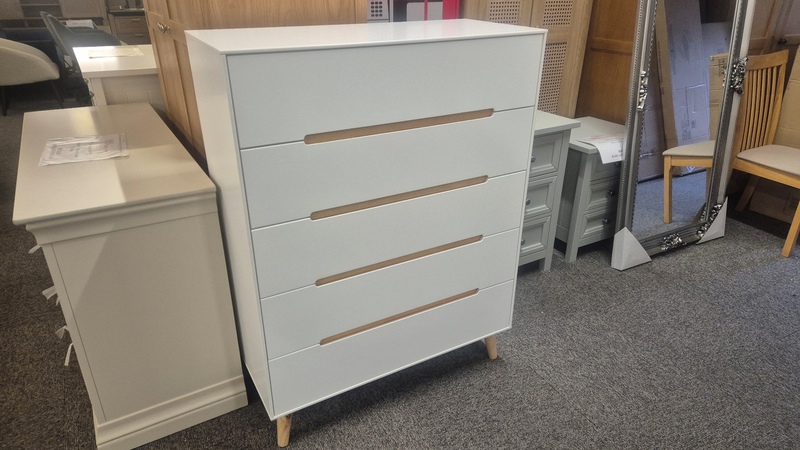 A stylish, retro-inspired chest with five large drawers in an immaculate matt white lacquered finish, with complementary tapered oak finish legs and recessed handles to provide easy opening. The sleek Scandinavian feel fits beautifully with any décor.