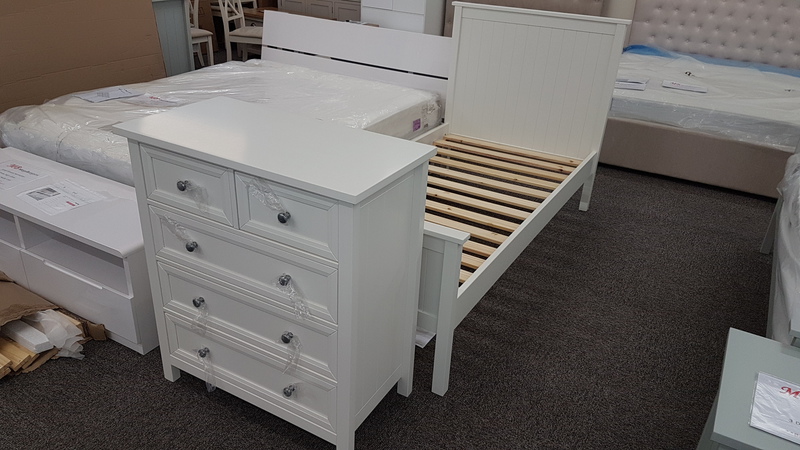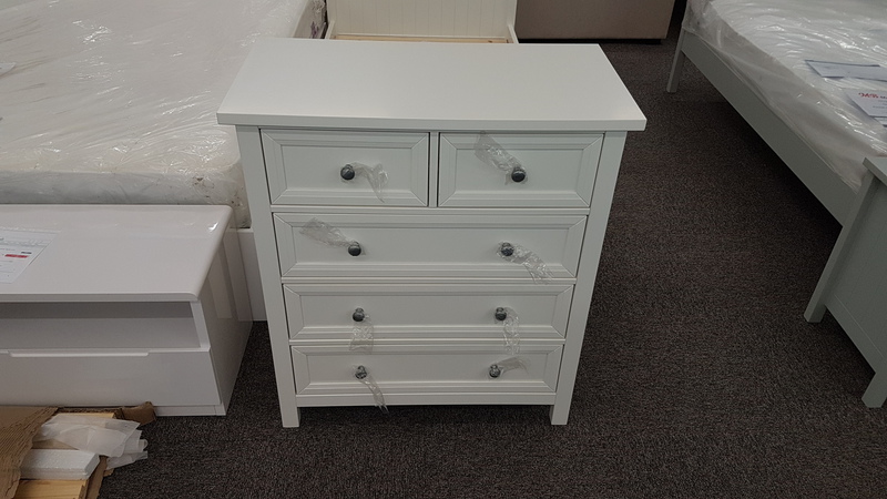 Maine is an elegant New England style range of bedroom furniture. The combination of exquisite surf white lacquered finish with characteristic side panelling and detailed chamfered cabinetry makes for a soothing and refined aesthetic with timeless appeal, while delicate pewter handles add the perfect finishing touch. The Maine 3+2 drawer chest offers great storage with three large drawers topped with two smaller drawers.
