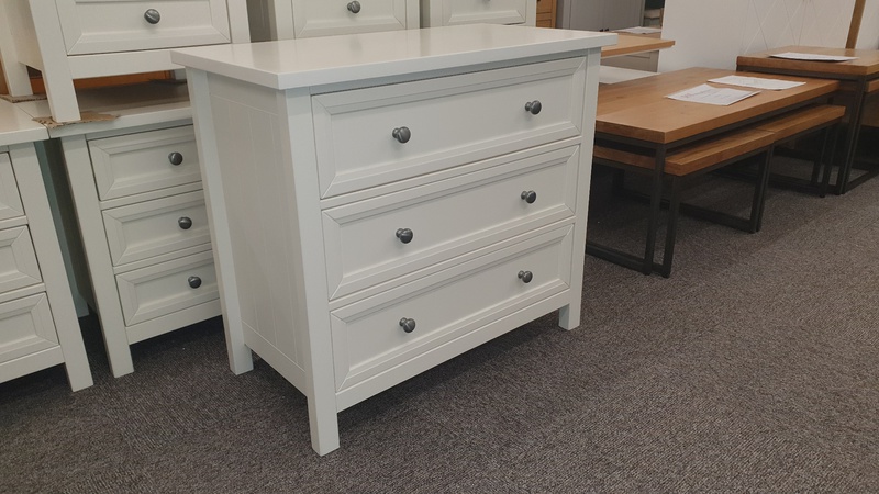 Maine is an elegant New England style range of bedroom furniture. The combination of exquisite surf white lacquered finish with characteristic side panelling and detailed chamfered cabinetry makes for a soothing and refined aesthetic with timeless appeal, while delicate pewter handles add the perfect finishing touch. The Maine 3 drawer chest offers three large storage drawers.