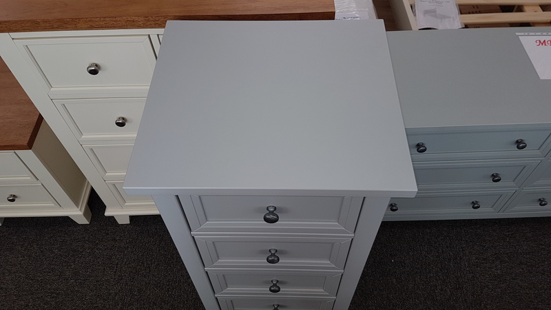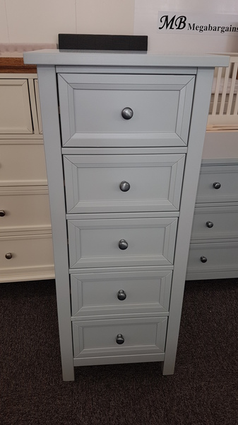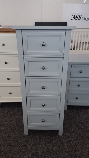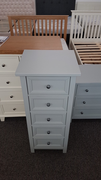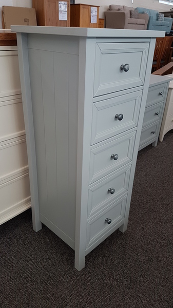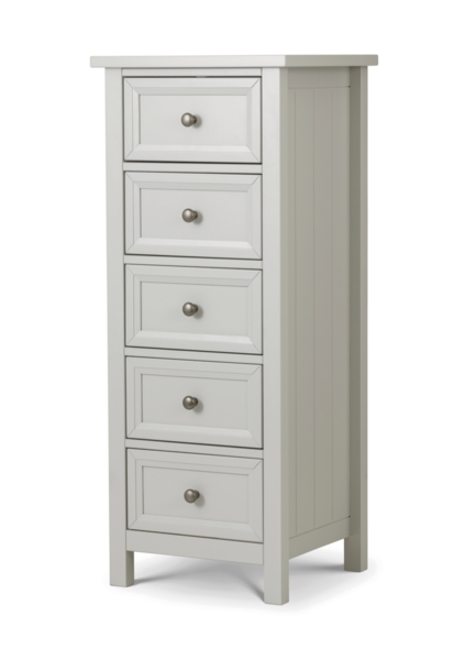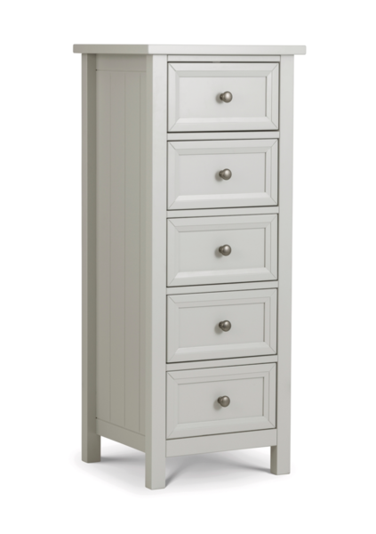 Maine is an elegant New England style range of bedroom furniture. The combination of exquisite dove grey lacquered finish with characteristic side panelling and detailed chamfered cabinetry makes for a soothing and refined aesthetic with timeless appeal, while delicate pewter handles add the perfect finishing touch. The maine 5 drawer tall chest's compact footprint makes it a great storage solution for smaller bedrooms