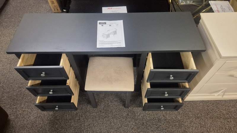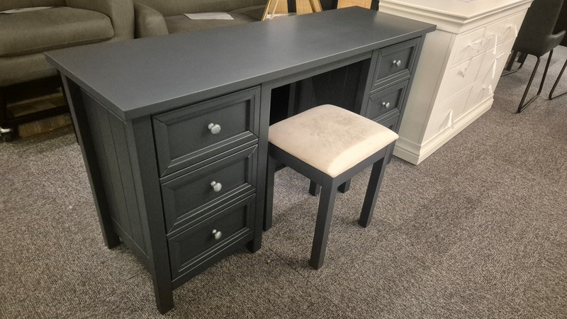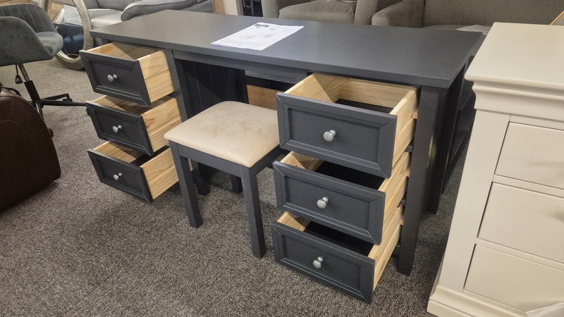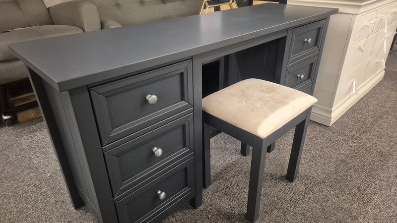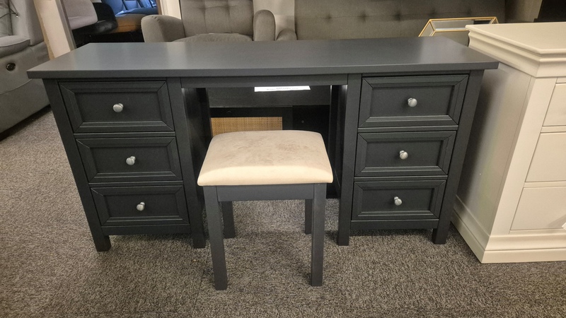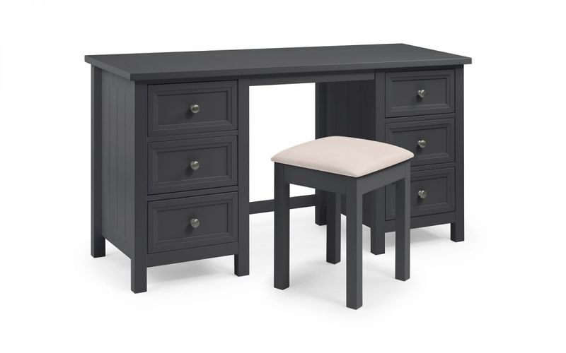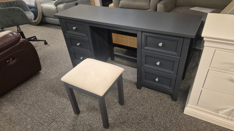 Maine is an elegant New England style range of bedroom furniture. The combination of exquisite anthracite lacquered finish with characteristic side panelling and detailed chamfered cabinetry makes for a soothing and refined aesthetic with timeless appeal, while delicate pewter handles add the perfect finishing touch. The Maine Dressing Table offers copious amounts of storage with 6 drawers. The perfect match for the Maine Dressing Stool.