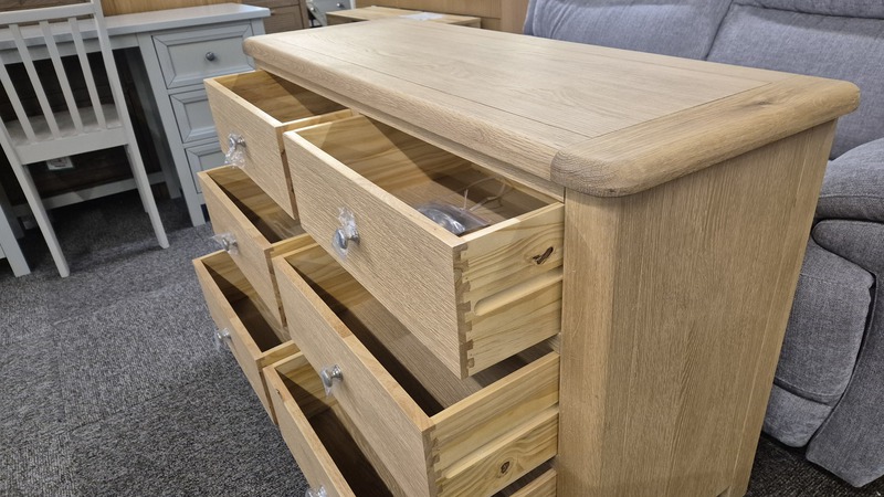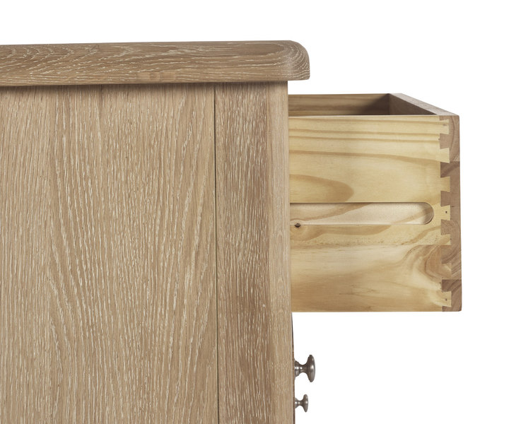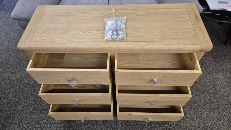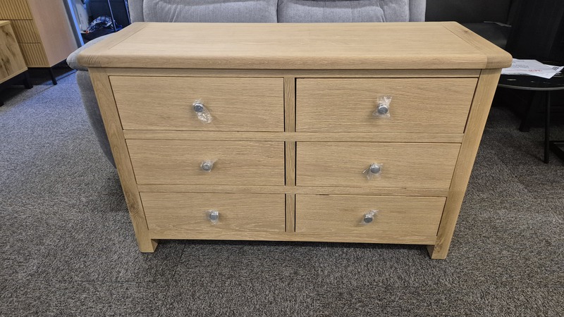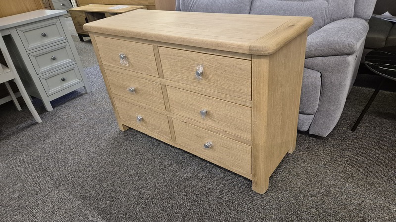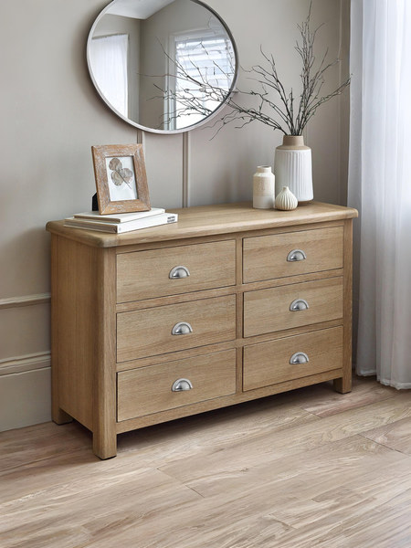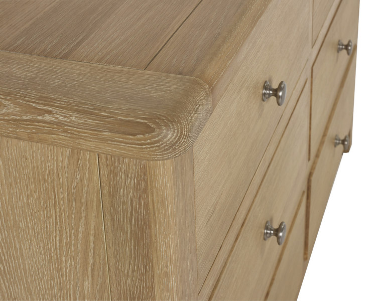 The Memphis 6 Drawer Wide Chest is finished in a gorgeous limed oak, providing a smooth curved edging that will add a timeless look to any bedroom space. This sleek design features six wide drawers providing convenient storage space for all your necessities which are elegantly finished with bulbous polished silver handles.