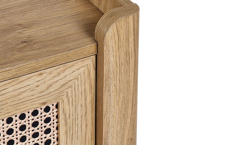 A beautifully sleek design with a bohemian feel, this 3 Drawer offers exquisitely curved edging accompanied by a raised lip around the edge providing a practical addition, stunningly combined with a rattan-styled front. Finished with a natural oak effect featuring three drawers providing the perfect ample storage space for any key essentials with gloved handles for easy access. Creating the perfect airy, warm feel within your home.