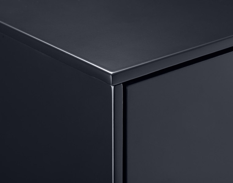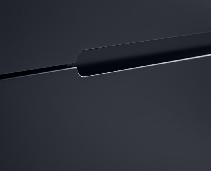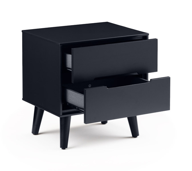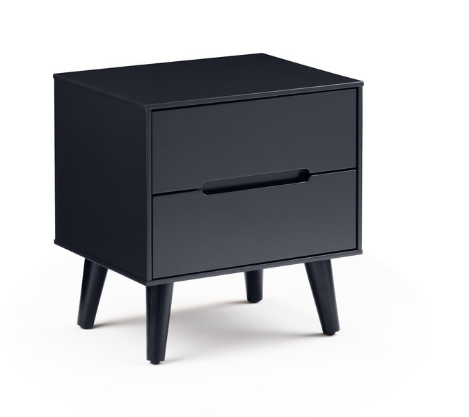 A stylish, retro-inspired bedside cabinet with two drawers in an immaculate matt anthracite lacquered finish, with complementary tapered black finish legs and recessed handles to provide easy opening. The sleek Scandinavian feel fits beautifully with any décor.