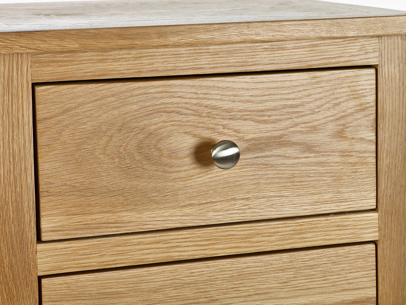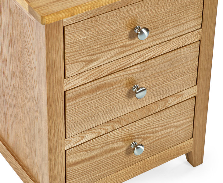 The Mallory 3 Drawer Bedside, crafted from solid oak and oak veneers, features 3 spacious drawers perfect for storing those items needed at hands reach from your bed. The simple, yet stylish design with beautiful silver knobs perfectly complements any bedroom decor.