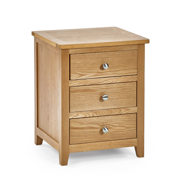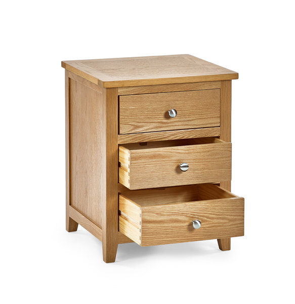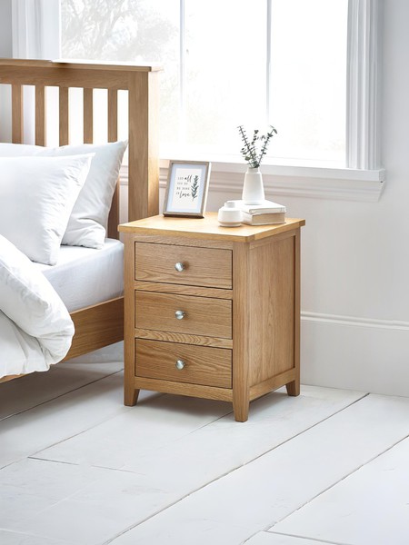 The Marlborough Oak 3 Drawer Bedside has a 30mm chunky top, clean lines and a sumptuous waxed finish, it is crafted from solid white oak and oak veneers and drawers feature dovetail joints. Beautifully constructed using the finest American White Oak and Oak Veneers, it will complement both traditional and contemporary décor.