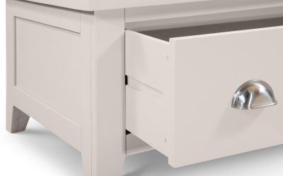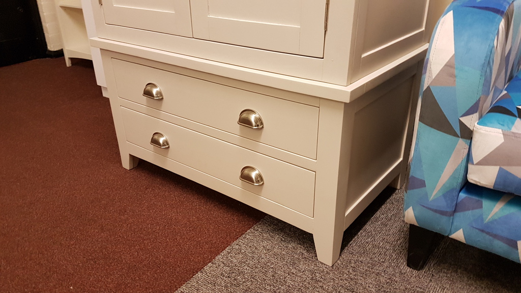 Finished in a elephant grey lacquer, the Richmond bedroom range is a timeless, elegant design suitable for a wide range of décor. Constructed from white oak and oak veneers, this lacquered bedroom range brings a modern twist on a traditional construction. With ample hanging space behind two doors, and two storage drawers, this 2 door combination wardrobe meets all your needs for spacious storage for your clothes.