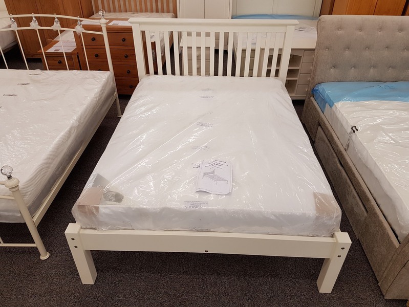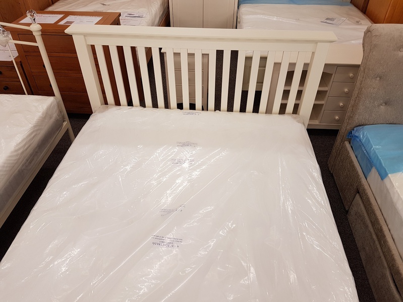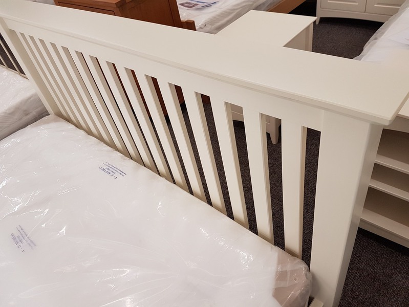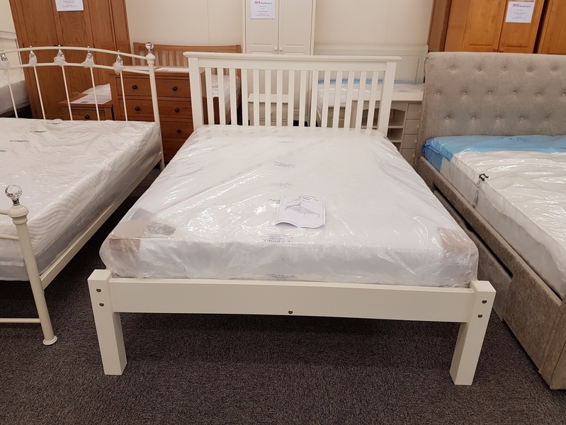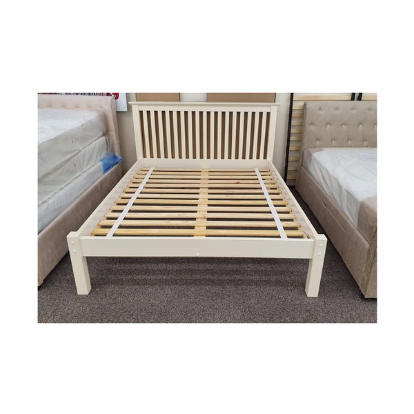 An imposing bed frame made from solid pine and MDF in an immaculate stone white lacquered finish. Its timeless shaker style sits equally well alongside contemporary and traditional interiors. Substantial posts and capping combine with a solid pine slatted base to ensure an incredibly robust and durable bed frame.