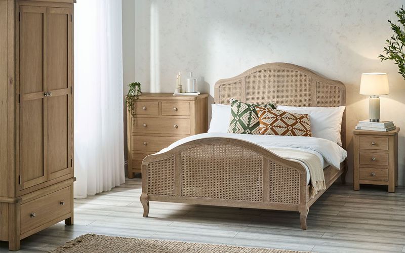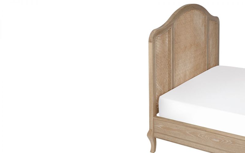 Introduce rustic elegance and classic charm to your bedroom with the Fleur Rattan Bed in Light Oak. This beautifully crafted bed features a graceful arched headboard and footboard with intricate rattan detailing, complemented by fine line accents that exude sophistication. The light oak finish enhances the wood's natural beauty, creating a warm, inviting atmosphere. Designed for both durability and style, the solid wooden frame is supported by elegant cabriole legs, offering a touch of French-inspired flair. With simple assembly, you can quickly enjoy this stylish centerpiece in your space. Mattress sold separately.