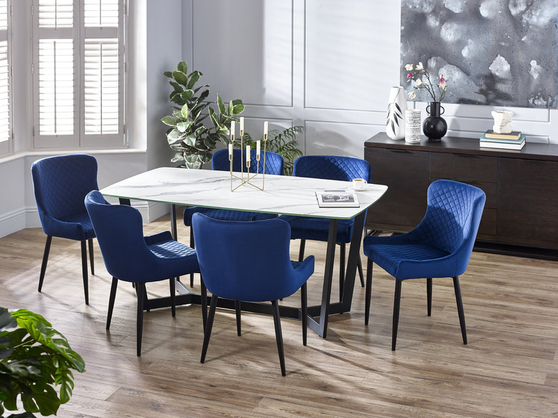 Combining a classic style with a modern twist, the Luxe dining chair is beautifully upholstered in a blue velvet fabric with luxurious quilted detailing. Featuring contemporary black painted legs, this dining chair adds a touch of elegance to any dining area.