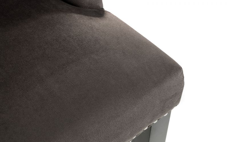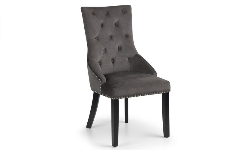 Upholstered in a soft touch luxurious grey velvet fabric, the Veneto Knockerback chair has a metal ring detail on the back along with glamourous deep buttoning and a metal stud trim. Finished with sturdy black lacquered legs, this chair is perfect as a statement standalone or as part of a dining set