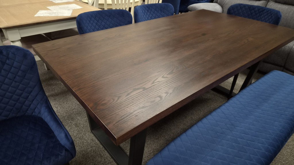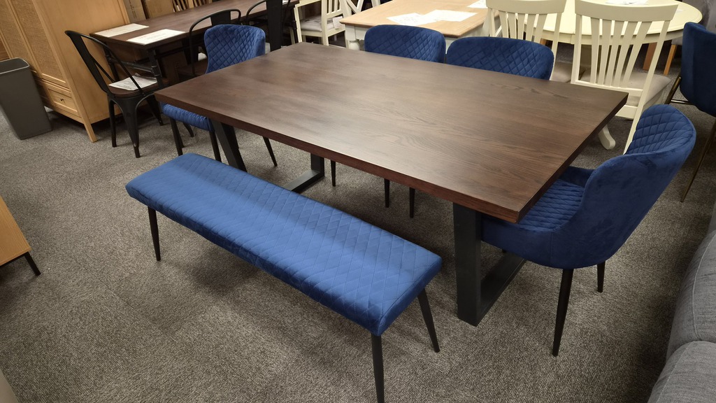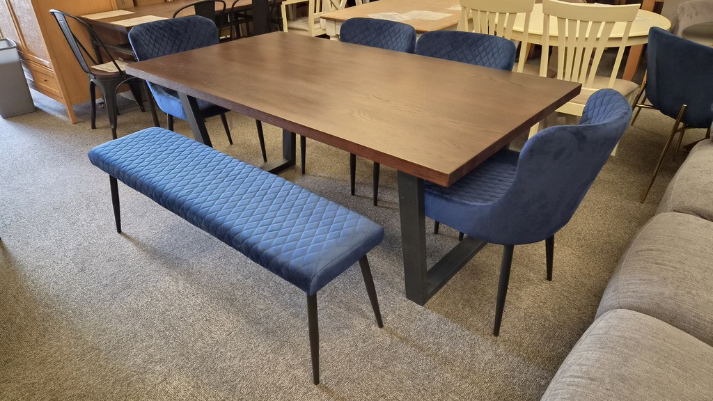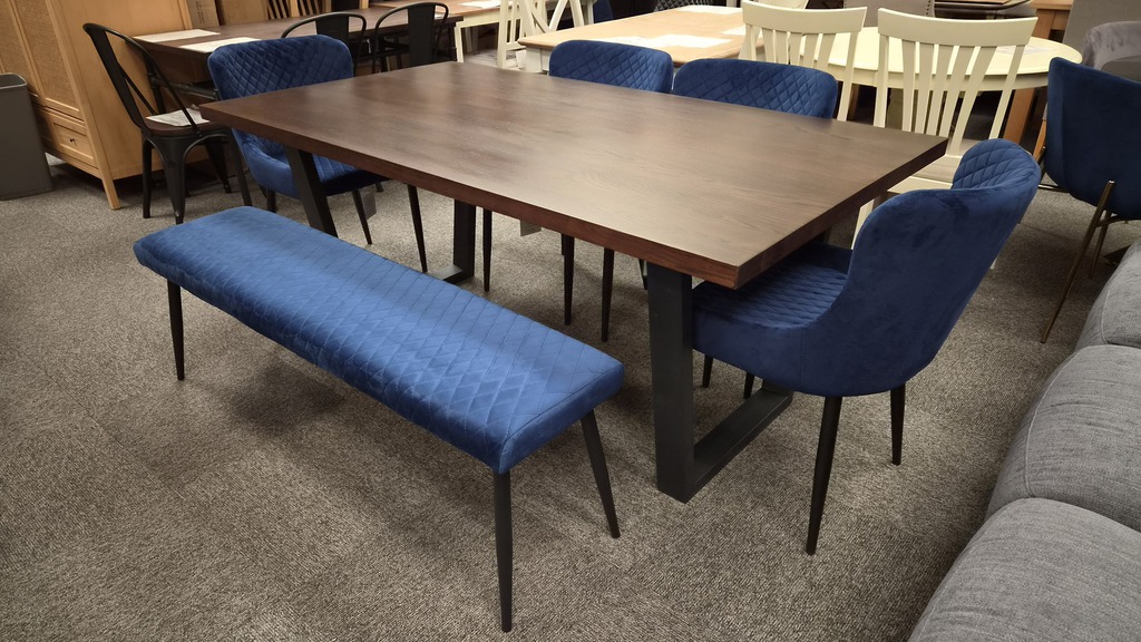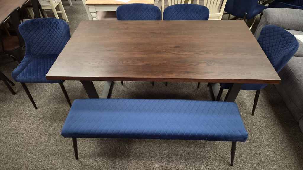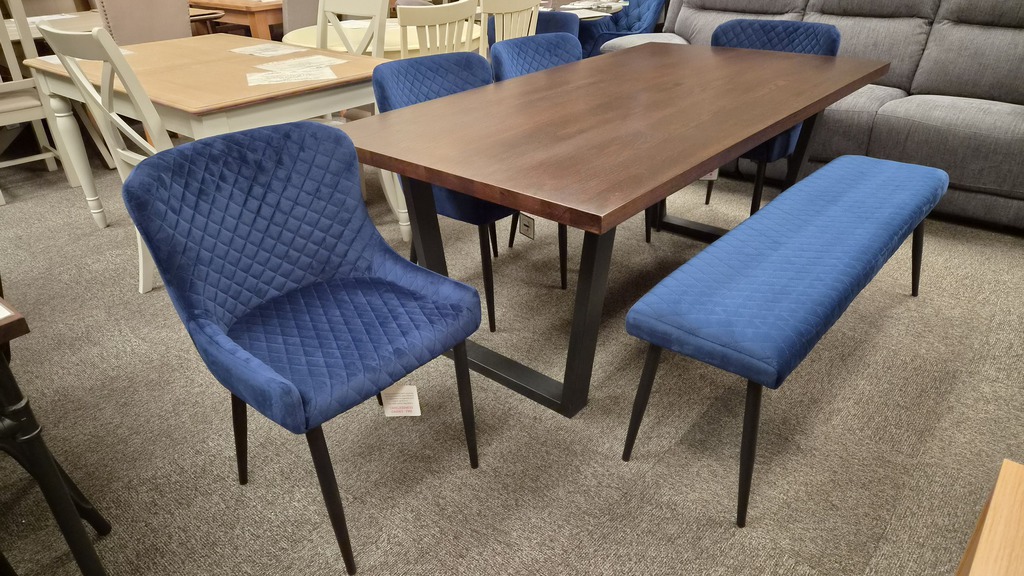 Brooklyn Dark Oak Dining Table, Luxe Low Back Benches & 4 Chairs - Blue