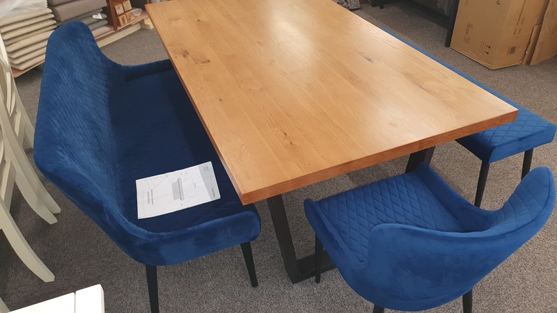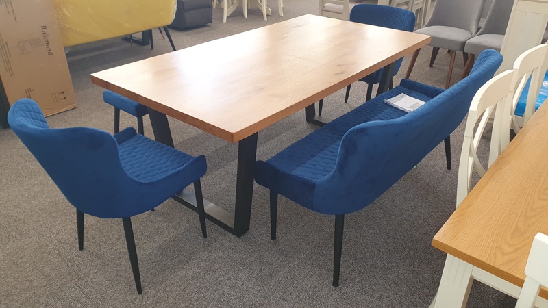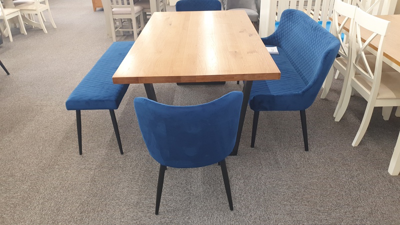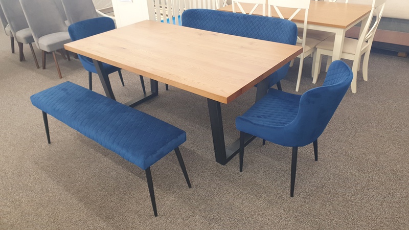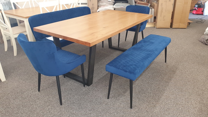 Brooklyn Oak Dining Table, Luxe High & Low Back Benches & 2 Chairs - Blue