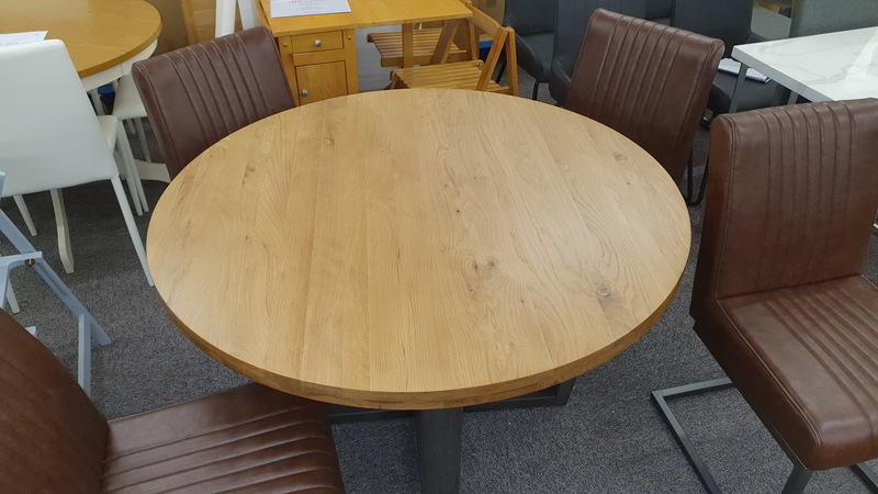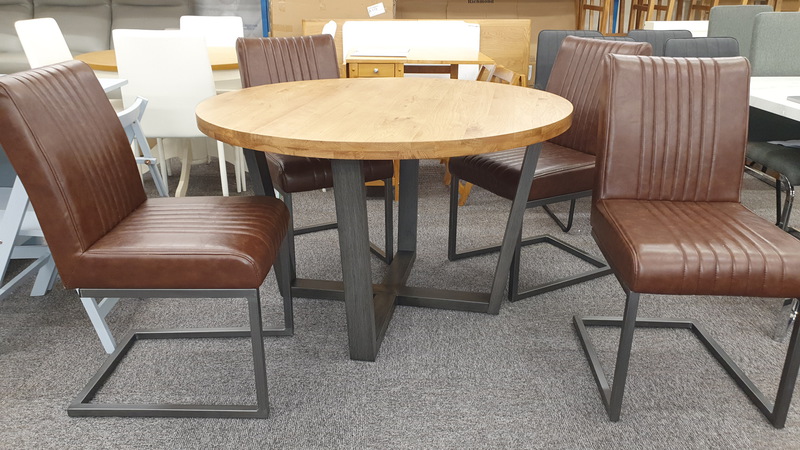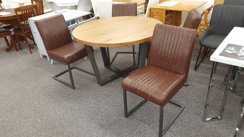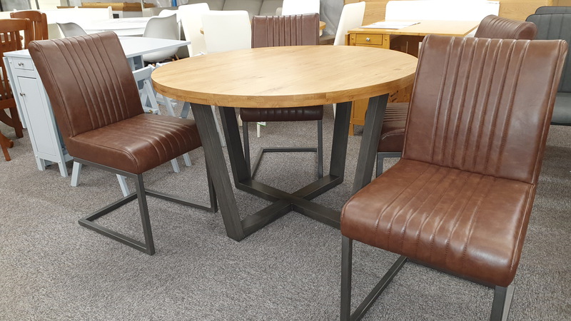 Made from solid oak, this round dining table offers a rustic finish emphasising the stunning natural wood grain. The Brooklyn Round Dining Table offers a vintage edge featuring industrial trestle style metal legs. This spacious table can seat up to 4 people, perfect for a wide range of modern decor. Part of the Julian Bowen Brooklyn Dining and Occasional Collection. Accompanied by 4 Brooklyn Dining Chairs. The Brooklyn Dining Chair has an industrial, retro design in a vintage brown faux leather finish with a cantilever style gunmetal leg frame.
