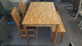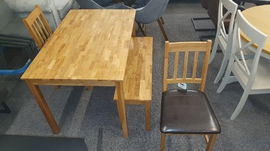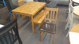 Solid Oak Dining Table in a Rich Oiled Finish and featuring a matching Solid Oak Dining Chair with padded Brown Faux Leather Seat.