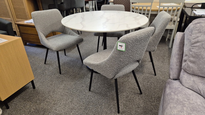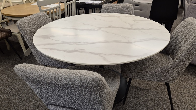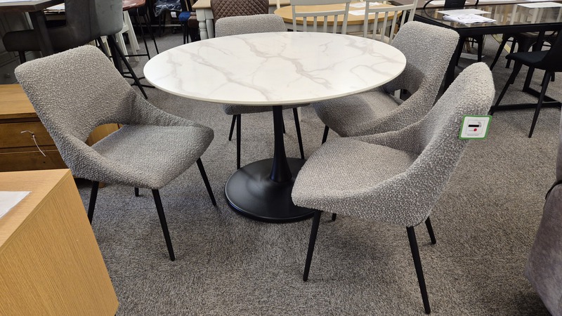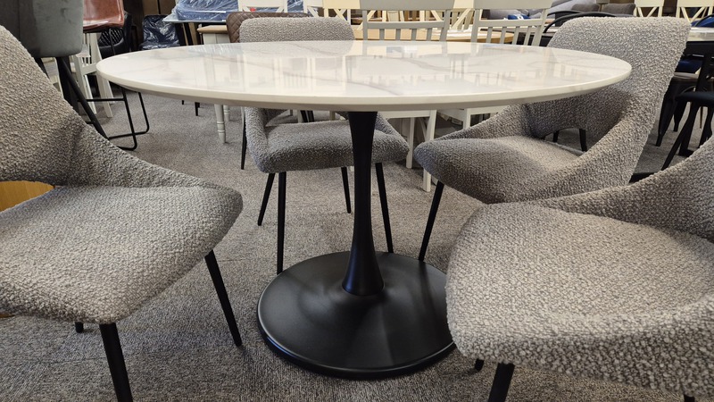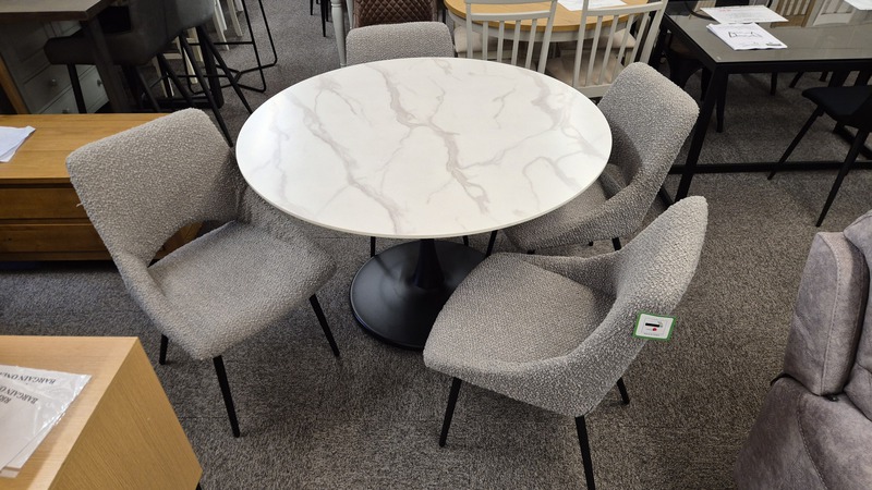 Holland White Marble Round Pedestal Table & 4 Iris Boucle Dining Chairs