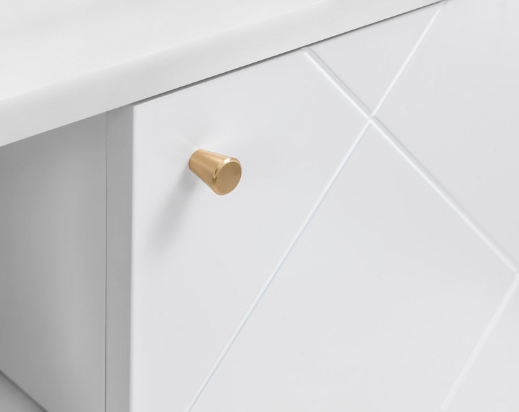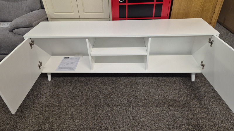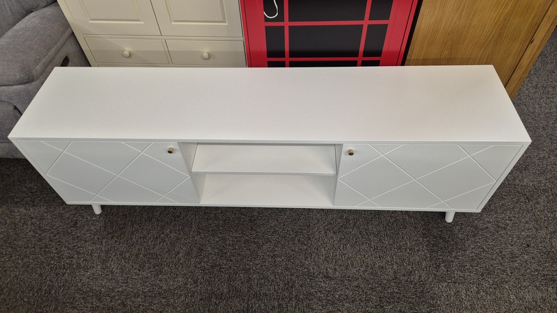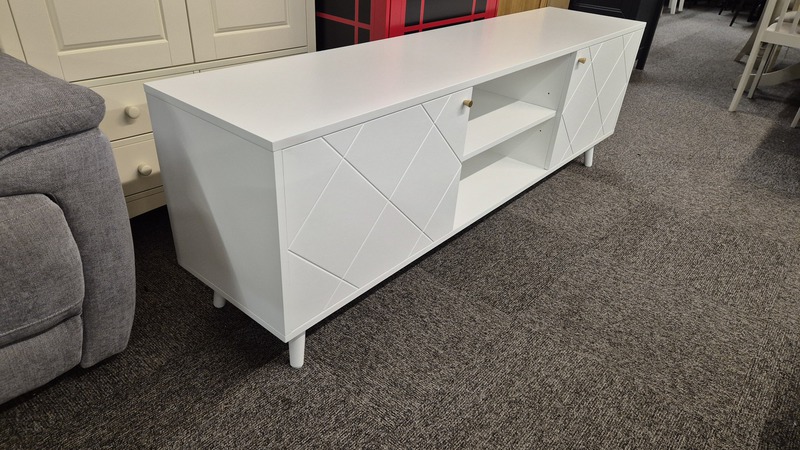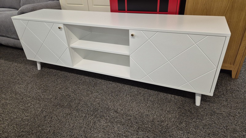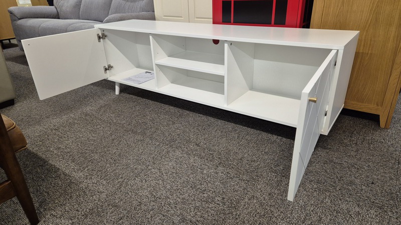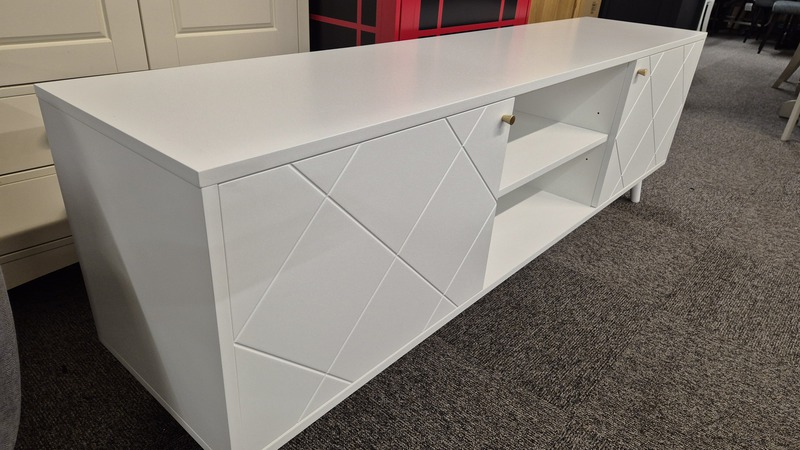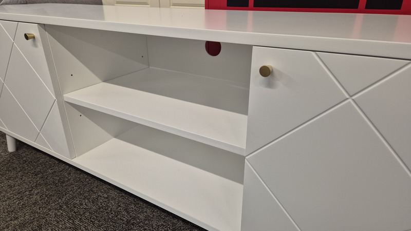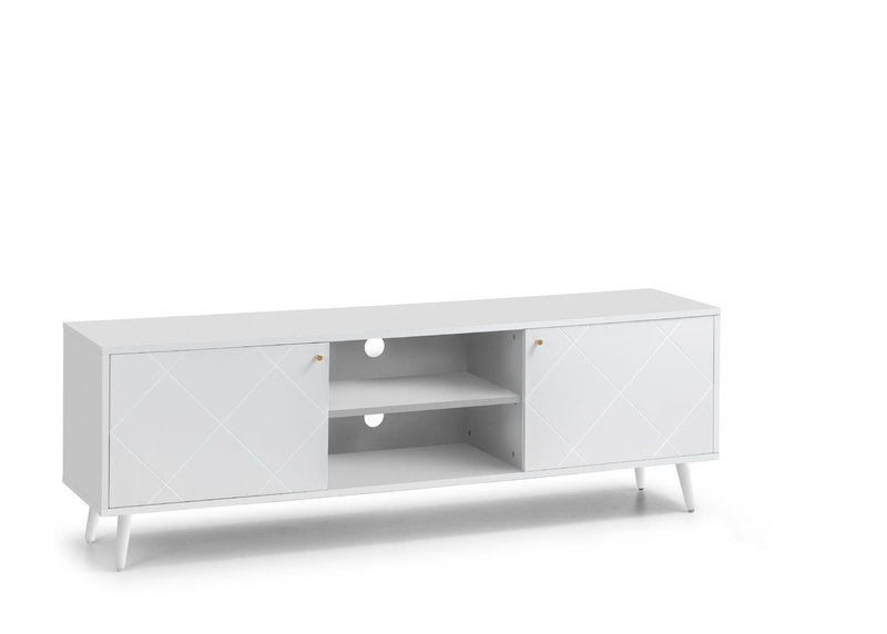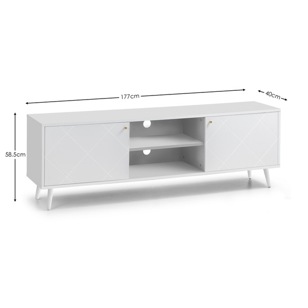 A subtle, yet striking linear pattern creates the eye-catching slickness of the Moritz TV Cabinet. Featuring two shelves with two holes for cables to sit neatly through the back of the cabinet, and two cupboard doors, with simplistic, yet stunning gold handles. The Moritz TV Cabinet is available in White or Grey, offering great functionality that looks good with any modern décor.