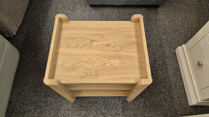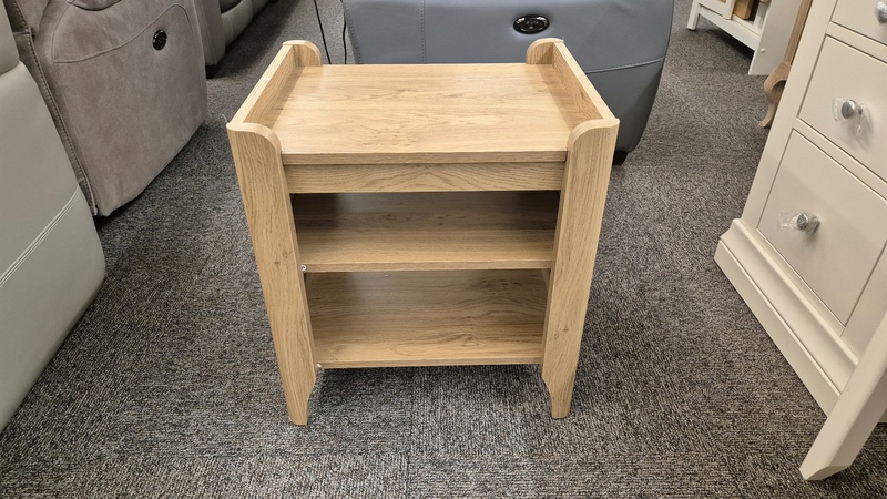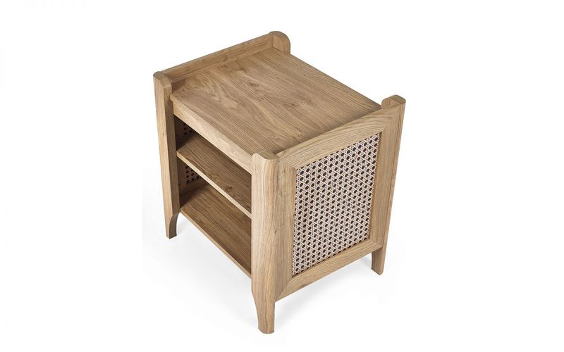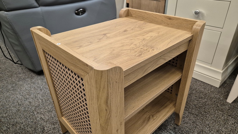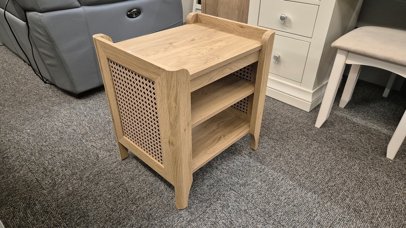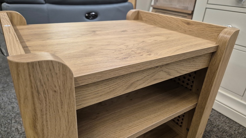 Showcasing a beautifully sleek design with a bohemian feel, this Lamp Table offers exquisitely curved edging accompanied by a raised lip around the edge providing a practical addition, stunningly combined with a rattan effect front. Finished with a natural oak effect featuring a removable shelf allowing you to store key essentials both on the top and bottom of the table. All around creating the perfect airy, warm feel within your home.