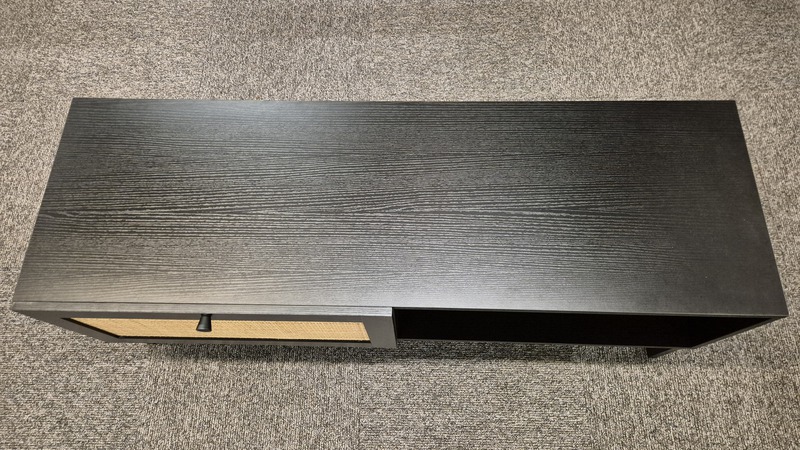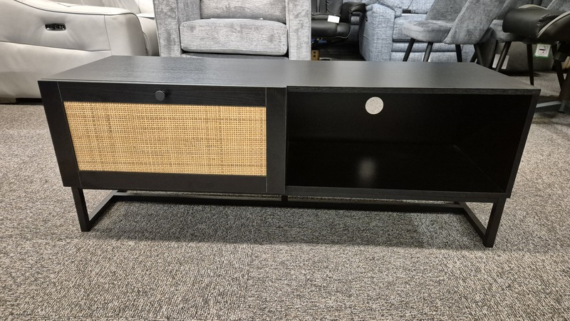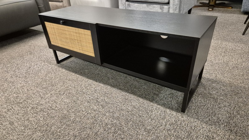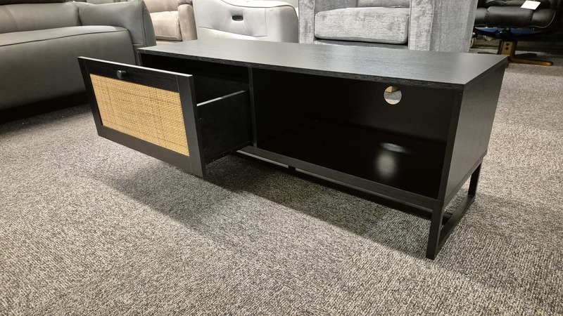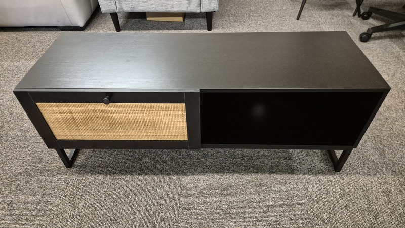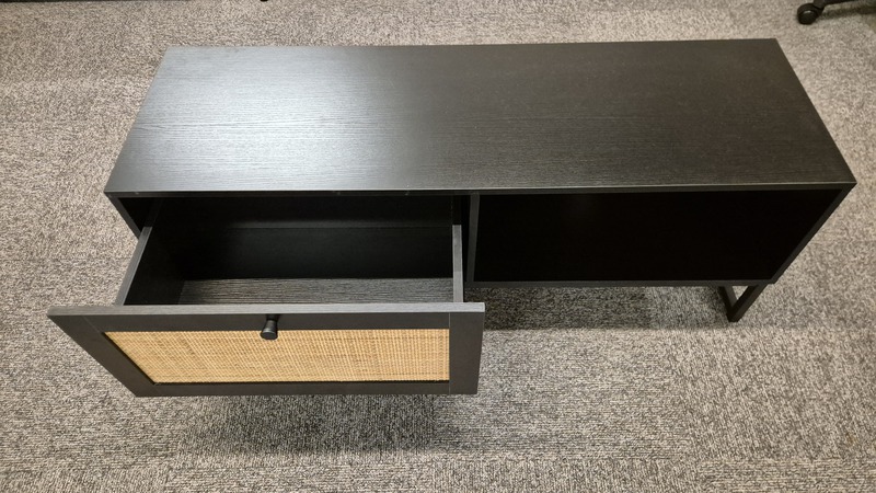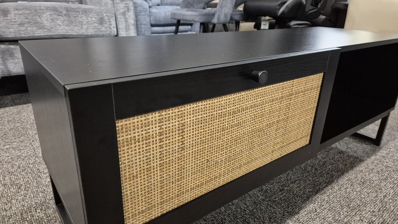 Elegant Design: Crafted with a stylish matte black finish and complemented by chic rattan drawer front, this TV unit adds a touch of sophistication to any living space.