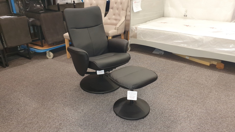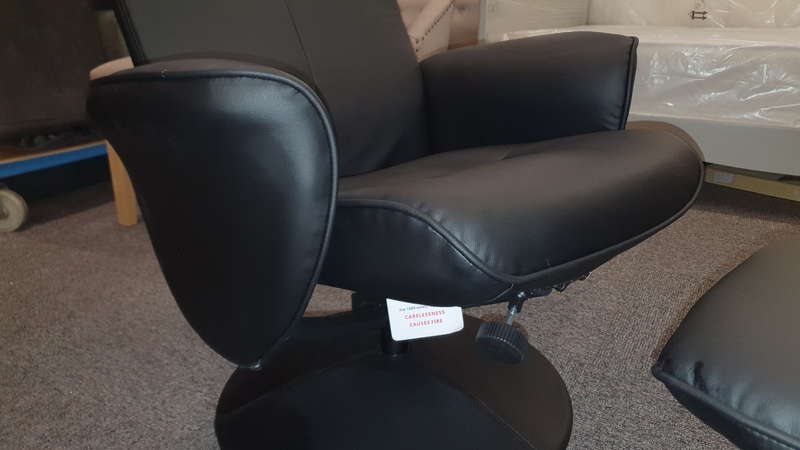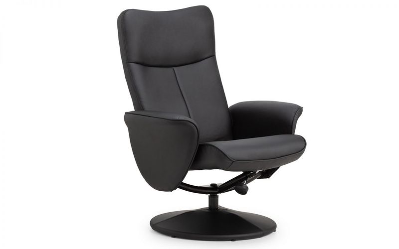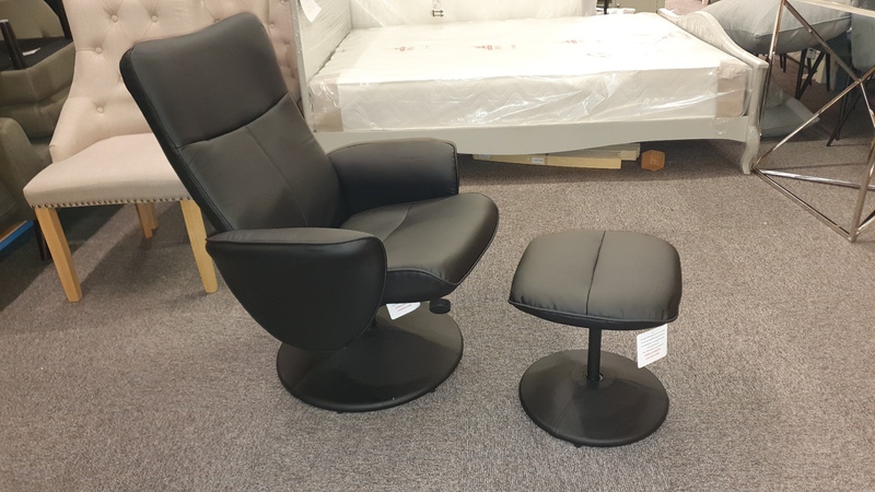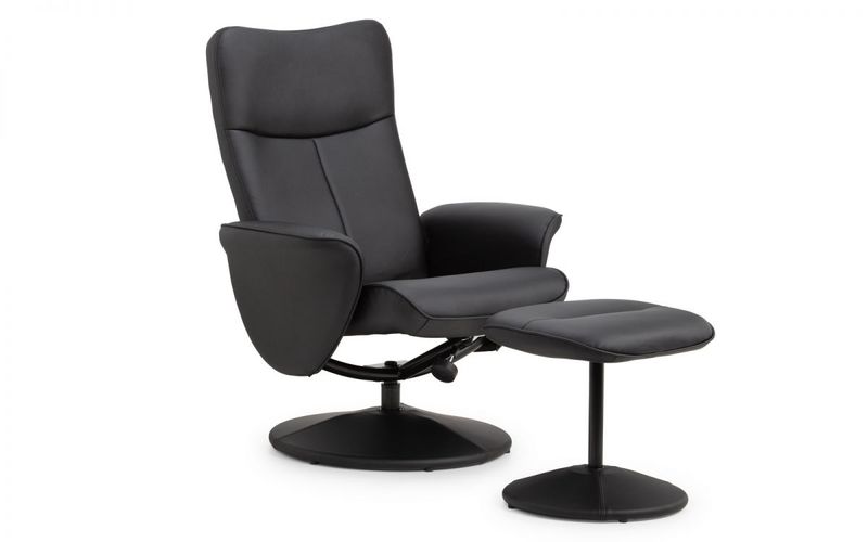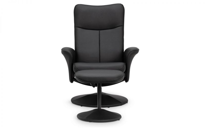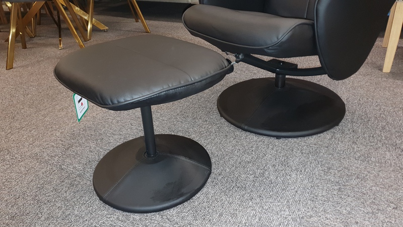 The Lugano Recliner and Footstool provides simple style, with a black faux leather finish with a pedestal base, perfect for the modern home. Providing comfort and practicality this chair swivels aswell as reclining, allowing you to reach your preferred position at ease.