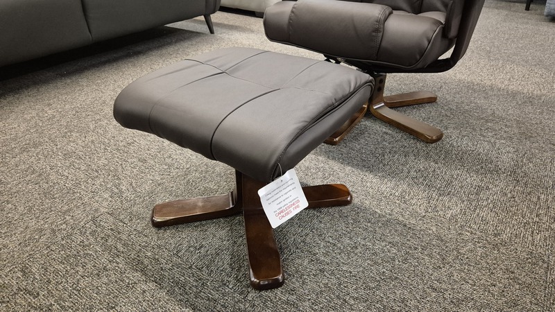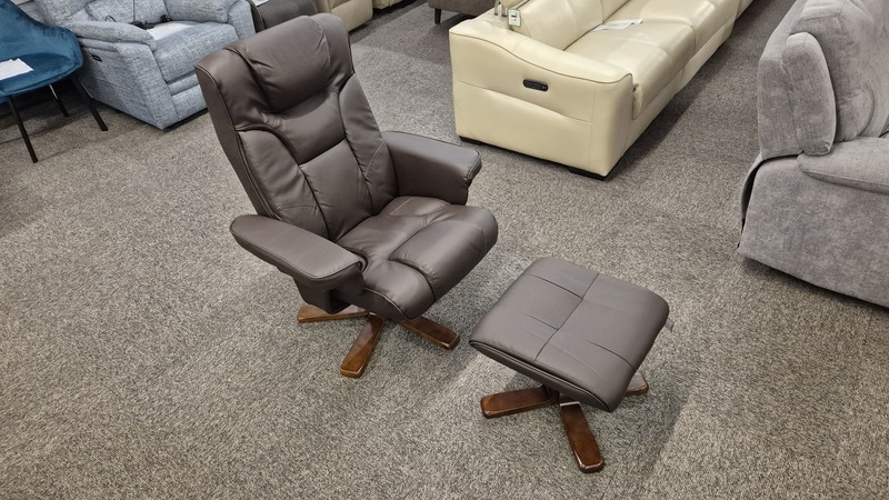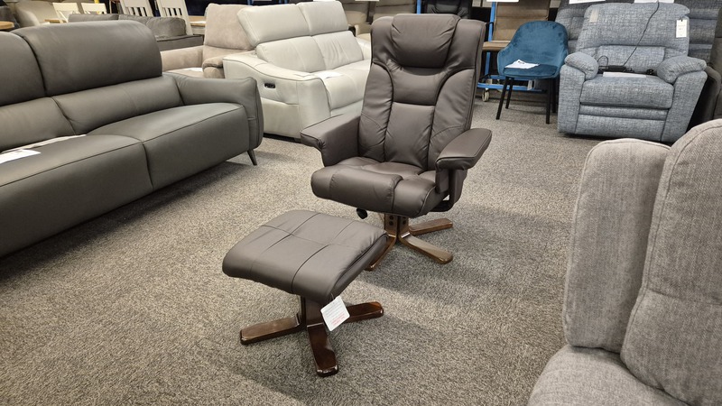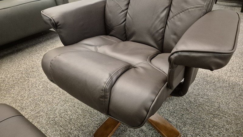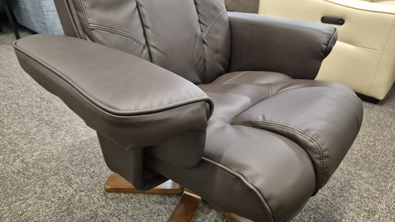 The Malmo reclining swivel chair and stool is upholstered in a soft touch faux leather with a walnut colour laminated base. This chair offers the ultimate in complete sitting comfort and relaxation.